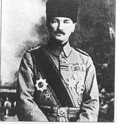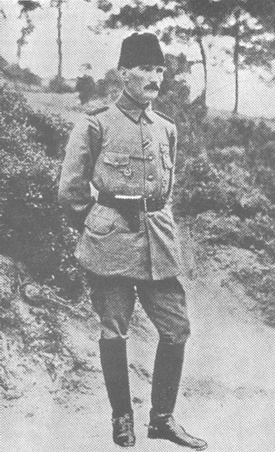 Mustafa Kemal Ataturk was born in Salonica (then part of Turkey, but now in Greece) in 1881, died 10 November 1938. As a military man, he had an amazing record. He never ever lost a battle. In 1915 he was Colonel in charge of the Anafarta (the name of a small village near the Anzac landing site) section of the Gallipoli Peninsula. This was the very landing area of the Anzacs. Had he not been there at the exact time he was, the landings might have been successful. Hearing the battle noise, he rushed his men, without waiting for orders from the General in charge, to the top of Chunuk Bair. From there he saw the landings and knew immediately that the key to saving the whole Gallipoli Peninsula was to make sure that Chunuk Bair, and the other hill tops, were not lost. By his personal genius and bravery he was able to lead the Turkish soldiers and stop the Anzac advance on the morning of 25 April 1915. He did not leave the battle zone again until after the Allies had evacuated the peninsula in December 1915. His life was saved on one occasion by his pocket watch, which stopped a bullet hitting him in the heart. (Moorehead, GALLIPOLI) |
