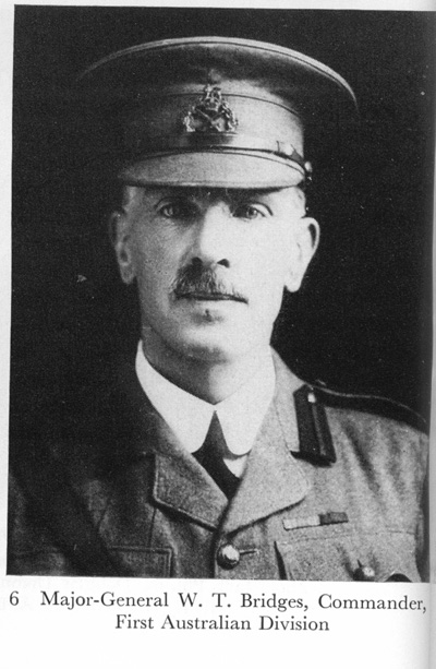 Major-General Sir William Bridges, General Officer Commanding Australian Imperial Force. General Bridges was hit in the thigh by a sniper in Shrapnel Valley and he died of his wounds on 18 May 1915. (Q.E.II Army Museum, Waiouru) |