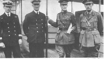 Commander- in -Chief of the Mediterranean Expeditionary Force. (General Hamilton is in the centre holding on to the pole) The British Navy and Army leaders at Gallipoli. They are on the armed private boat 'Triad'. General Hamilton used this boat often during the Gallipoli campaign, as he moved around the Gallipoli Peninsula trying to find out what was going on. From the left, Commodore Keyes, Vice-Admiral De Robeck, General Hamilton, Major-General Brathwaite (Imperial War Museum) General Sir Ian Hamilton is the man holding on to the pole. His left arm is at a funny angle, the result of an injury in a previous war in Afghanistan. On his left is Major-General Brathwaite, one of his headquarters generals, while on his right is Vice-Admiral De Robeck who was the leader of the British Navy. On the end is Commodore Keyes, who was the British Navy second in charge. General Sir Ian Hamilton was 62 when he was appointed by Lord Kitchener to command the Mediterranean Expeditionary Force. He was suddenly appointed when it was realised that the British Navy might not get through the Dardanelles by themselves, and a back-up plan might be needed. Appointed on 13 March, he was given just a few weeks to put everything together. He was given confusing orders and muddled instructions as to how to carry out the orders. Nothing was known about the Turkish forces, and a lot of guesses were made. They turned out to be wrong. Even the maps were wrong. In turn he created muddle and this sense of confusion continued on through the whole campaign. As a leader, once the landings were under way he made a continuing series of errors of judgment which caused many deaths, and which eventually led to the final defeat and withdrawal from Gallipoli in December 1915 and January 1916. These errors of judgment included appointing generals who simply could not do the job he required of them. Perhaps the greatest of all their mistakes was that they never learned from their mistakes, and just kept on doing the same things over and over again. His role perhaps could be summed up as that although he tried hard, he was given an impossible job to do in too short a time with the wrong sort of equipment. |