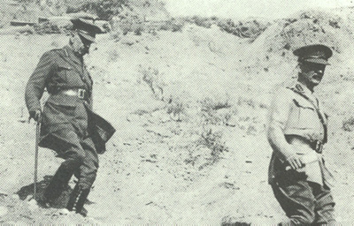 General Birdwood was wounded in the head on the same day as General Bridges was shot in the thigh. Birdwood recovered from this wound and continued in command. In this photo General Birdwood (on the right, in the light uniform) is seen with Lord Kitchener, when Field Marshall Kitchener visited Gallipoli himself to see exactly what was going on. He wanted to decide whether or not the Allies should withdraw from the Peninsula. (Imperial War Museum) |