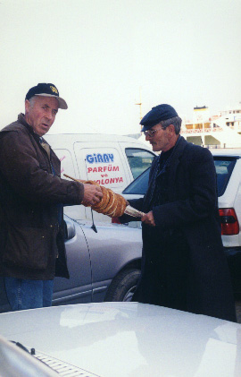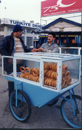 This man is selling freshly baked bread in the morning. It tasted a little like a bun, but it had no icing or sweetness to it. There were small nuts on the outside. I enjoyed eating it, even though I didn't have a drink with it. It was very cheap, so I had two or three for breakfast one morning. Notice the sign behind the men. Signs and flags like this were everywhere, celebrating 75 years of the Turkish Republic since it was founded by Mustafa Kemal Ataturk. |