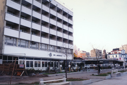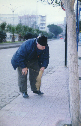 Keeping the shop front clean is just as important in Turkey as it is in New Zealand. This man is using a small brush to sweep the footpath outside his shop. It is still early in the morning and it was cold so he is wearing a woollen hat to warm his head. This is the main street of Canakkale. On the other side of the road is a large town square with a school on one side. |