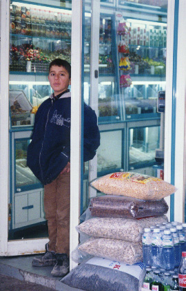 This young boy was waiting for customers to come along and buy. He smiled at me and invited me to enter his shop. The large plastic bags contain different kinds of nuts. Bottles of water and Coke are in the corner of the picture. Many Turkish people can understand some English. Everyone was very friendly and helpful. They seemed very kind towards New Zealanders because of the connection with Turkey at Gallipoli. |