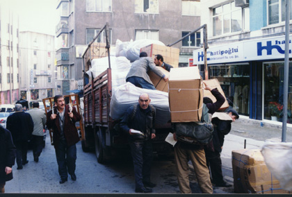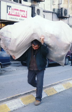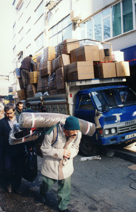 Istanbul used to be called Constantinople. It is a very crowded city. Where traffic could not get through everything would be carried on the back. Heavy boxes had to be carried on the back. Look at the man on the left. He has a wooden frame on his back to help carry boxes on. |