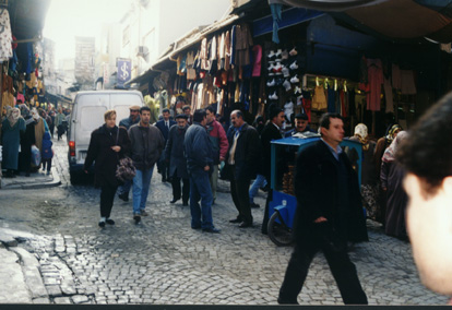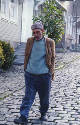 A Turkish man wandering along, deep in thought. Notice the road stones, called cobble stones. This kind of roading is very common in old parts of town. It is very noisy to drive over in a car. |