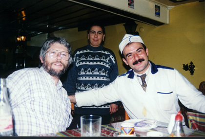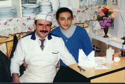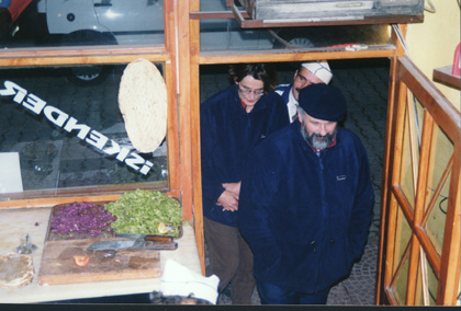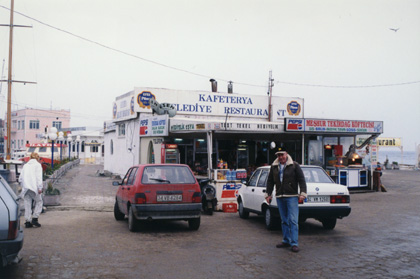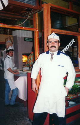 Restaurant Often people from a restaurant or shop would be standing outside trying to get the customers to come in and buy. This man in Canakkale was just about to ask men into his restaurant. |