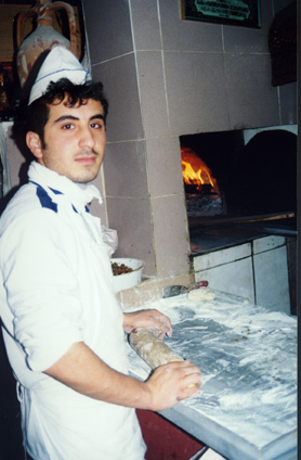 Often too, all the bread is cooked in front of the customers. This man is preparing the bread for baking in the oven. |