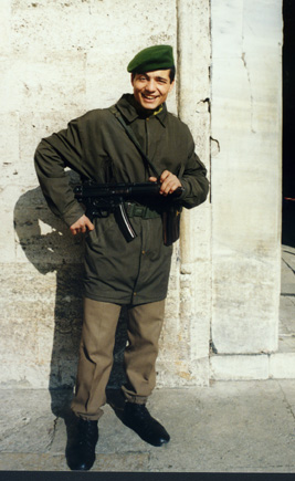 One of the armed soldiers guarding the Museum and jewels. That is a real machine-gun he had. There was another guard on the other side of the doorway. |