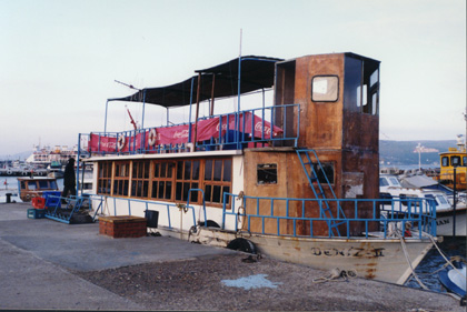 There were some interesting looking boats in the harbour. This one was set up to take people for rides up the Dardanelles. I'm not sure I would care to travel on it, however! |