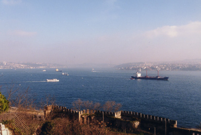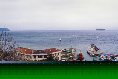 The Dardanelles lead into the Sea of Marmara. Istanbul is at the end of the Sea of Marmara. The waterway becomes very narrow here. The waterway is now called "The Bosphorus". It is an extremely busy shipping lane, going up to the Black Sea and Russia. It was this shipping lane that the Turks had blocked in 1914, not allowing the Russian ships out, that the British wanted opened again. That was the first reason for the battle at Gallipoli. |