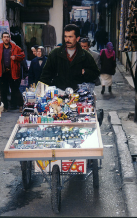 In the narrow streets of Istanbul people would try to sell anything. This man has a wheelbarrow as his shop on wheels. |