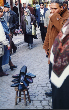 Would you like a pair of shoes? Right in the middle of the road this man was selling these shoes. Notice the pattern in the cobble stones. This pattern is very common right across Europe. Notice too, the man in the background trying to get customers to come into his shop. |