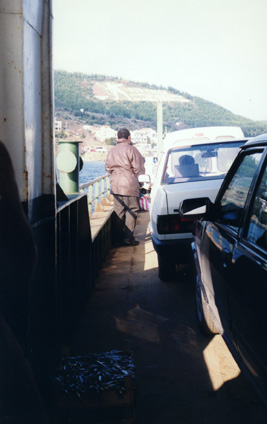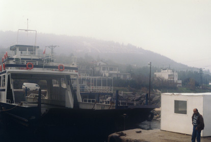 Kilidbahir is a little village tucked against the hillside opposite Canakkale. This car ferry just pulls in against the bank and unloads the cars. It also takes school children over to Canakkale each day. |