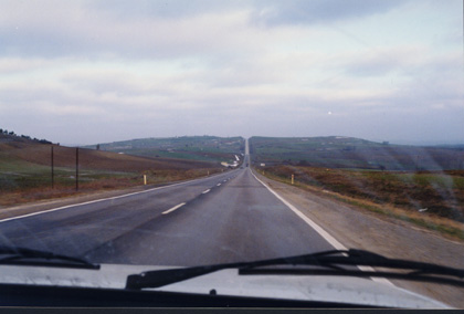 The long straight road down the Gallipoli Peninsula. Notice we are driving on the right-hand side of the road. It had snowed the previous week and in places drifts of it were still beside the road. |