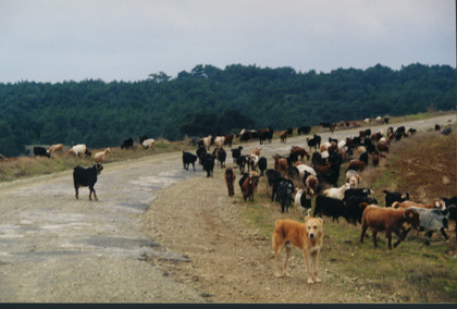 Sheep grazed the side of the road in places. No fences though. A man with a dog was always looking after them. In New Zealand the sheep would go in front of the farmer. Here the sheep always followed him. |