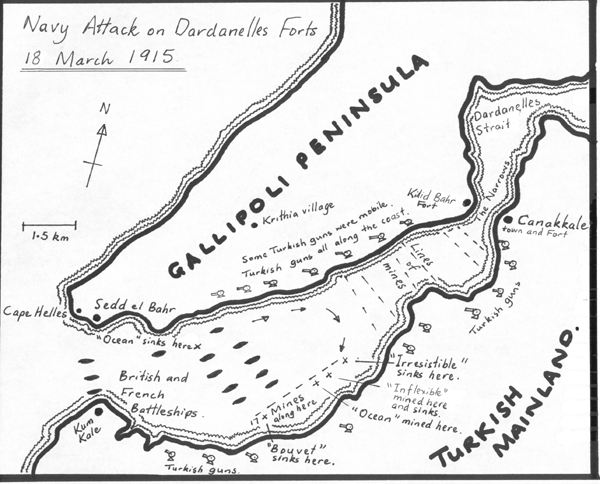 This map shows the attack plan the British and French navies made on the Turkish defences in the Dardanelles Straits on 18 March 1915. The attack failed when the British and French ships began to be sunk by hidden Turkish mines. After this failure by the navies the British decided they needed to put an army ashore to destroy the forts first. The battleships would then try again to go through the Dardanelles Strait. The names of the British and French battleships involved in the attack on the Dardanelles Strait defences on 18 March 1915 were: 1. HMS 'Queen Elizabeth', 2. HMS 'Inflexible', 3. HMS 'Agamemnon', 4. HMS 'Lord Nelson', 5. HMS 'Ocean', 6. HMS 'Irresistible' 7. HMS 'Albion', 8. HMS 'Vengeance', 9. HMS 'Swiftsure', 10. HMS 'Majestic', 11. HMS 'Canopus', 12. HMS 'Cornwallis' 13. 'Suffren', 14. 'Bouvet', 15. 'Gaulois', 16. 'Charlemagne', 17. HMS 'Triumph', 18. HMS 'Prince George' Battleships numbers 13, 14, 15, 16 were French warships. All of the battleships were British. |