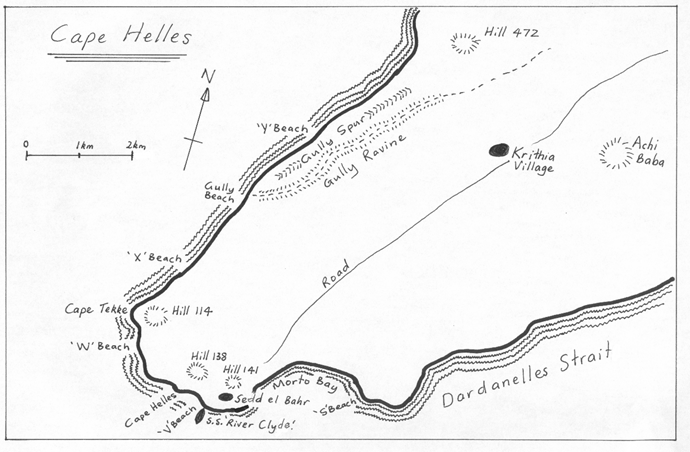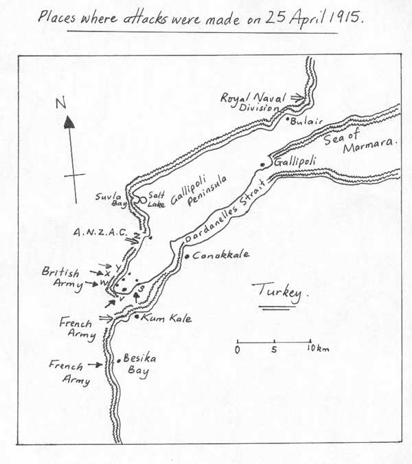 The map above shows the places attacks were made on 25 April 1915. Australia and New Zealand: 'Z' Beach. The first attack was by the Australians at around 4:00 am. It was supposed to be at Brighton Beach, but landed 1.5 km north at A.N.Z.A.C. Cove. The New Zealanders began landing at Anzac Cove around 10:00 am. In the British plan this was called 'Z' Beach. British: 'V' Beach Right beside the fort at Sedd el Bahr. The ship S.S. "River Clyde" was run ashore with 2000 men aboard to try to land them quickly and overwhelm the defences. This also quickly turned into a disaster with many hundreds of men needlessly killed when it was discovered that the navy attack had not destroyed the defences. The Turkish soldiers were still sitting there, hidden and waiting for the British to try to land. 'W' Beach Very strongly resisted by the Turkish defenders. Yet again there were very many casualties. 'Y' Beach Totally successful at first. It was 4 km north up the coast. There was no one there to oppose them. The 2000 men landed sat down and had a cup of tea without getting any defences ready. Neither did they even try to go help the men at 'V' beach. At the time they sat down to have a cup of tea they could have completely destroyed all the Turkish defenders at 'V' beach. Later in the day the Turks arrived and attacked them, causing many casualties through lack of preparation. By the next morning there were almost 700 casualties from the 2000 men. 'X' and 'S' Beaches Easily done with only limited casualties from just a few defenders. However, these men were not able to help landings in other places. Soon the Turkish defenders were attacking them too and trapping the British in the landing places. Royal Naval Division They were to make a 'demonstration' up in the Gulf of Saros. Trying to confuse the Turkish defenders, they went there with ships and soldiers to make a lot of noise and activity. They were quickly withdrawn and used at Cape Helles. French: The French army safely landed and easily captured everything they planned. Over the next few days the French were withdrawn and sent to help the British at Cape Helles. |