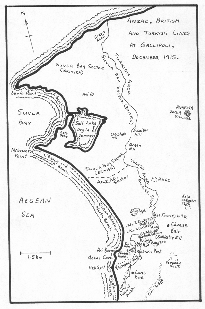 This small map lets you see the Suvla Bay and Anzac sectors together. This only happened after the British landed their soldiers at Suvla Bay on 7 August. The British soldiers were called the New Army, because the main British Army was fighting in France. These were new soldiers specially set out from Britain to fight at Gallipoli. They landed at Suvla Bay at the same time Australia attacked at Lone Pine and New Zealand tried to capture Chunuk Bair. As with all other attacks at Gallipoli, this landing too became a failure due to poor leadership and organisation. The map shows the trench lines as they were when the fighting finally ended in December 1915. The map after this one gives a bigger view of the area. |