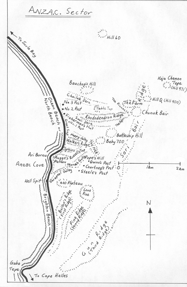 A small map of just the Anzac sector. The name sector was given to the area an army group was controlling. There were many tens of thousands of Australian and New Zealand men squeezed into just this little area, with as many Turkish soldiers squeezed in on their side. Everything was so close together, with the land so steep and rugged, the maps do not properly show how impossible the country was. This was another of the problems the British had in planning the landings. They did not properly understand just how bad the land was they were trying to put an army onto. |