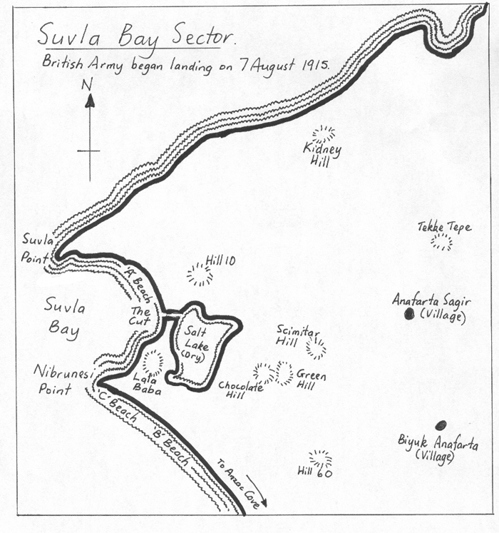 Landing at Suvla Bay would help to draw attention away from Chunuk Bair and allow the New Zealanders to capture it. The British New Army would then link up with the Anzacs and cross the Gallipoli Peninsula, cutting off all the Turkish soldiers in the south. But, yet again through poor planning and organising this did not happen. After landing safely on 7 August, the British New Army sat down for a rest for 2 days. Meanwhile the Turkish soldiers got themselves organised and when at last the British did try to move forward across the dry Salt Lake they were slaughtered by hidden guns on Green Hill, Scimitar Hill and other surrounding hills. After dreadful losses the British New Army just had to dig in right across the whole sector,from Kidney Hill in the north, down past Hill 60 in the south. The British eventually withdrew from here on 20 December 1915, the same day the Anzacs left Anzac Cove. |