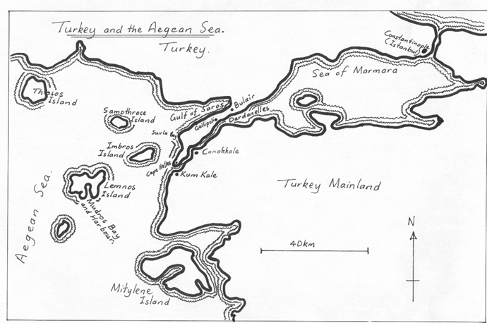 This map shows the area of Turkey, the Aegean Sea, the Dardanelles Strait, and Sea of Marmara across to Constantinople (today it is called Istanbul). Plan One: Was for the British and French navies to attack the forts at the entrance to the Dardanelles Strait. The ships would then sail through to Constantinople and shell the city. Turkey would panic and withdraw from the war. But the plan failed because the British and French navies could not get through. Ships were sunk and others damaged. The battleships had to withdraw. Plan Two: Was to get the army to land soldiers on the Gallipoli Peninsula and destroy them from behind. The battleships would then sail safely through to Constantinople. The invasion fleet gathered at Mudros Harbour on Lemnos Island in the days and weeks leading up to the attack. On the evening of 24 April the battle fleet set sail. The Australians and New Zealanders were taken to the Gaba Tepe area (just south of Suvla Bay) in the dark and unloaded into smaller ships and boats. They were supposed to land near Gaba Tepe, but by mistake in the dark were landed instead at the place we now call A.N.Z.A.C. Cove. The British were taken to the Cape Helles area and landed at 5 different beaches. The French were taken to the Kum Kale area and landed at 2 different beaches. A group of Royal Navy Division soldiers were landed ashore in the Gulf of Saros, near the village of Bulair. The French and Royal Navy Division attacks were pretend ones only. They were feints, designed to confuse the Turkish and keep men away from the real landing places on the Gallipoli Peninsula. |