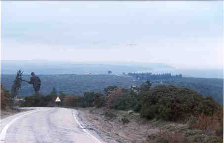 From this angle you can also see why it was so important for the Turkish defenders to control the heights. They could see everything the Anzacs were doing. Not only that, but the Anzacs then had to fight going up hill, which would wear them out more quickly. Looking down the ridge going up to Chunuk Bair. The beautiful Turkish Memorial in the last picture is just out of sight on the left. A statue to Turkish soldiers is straight ahead. The white parts are Courtney's and Steele's Posts Cemeteries, Quinn's Post Cemetery, Johnston's Jolly Cemetery, with Lone Pine Memorial on the ridge. Gaba Tepe is the point of land in the distance, just above the tree line. Shrapnel Valley is down on the right.You can see the edge of the cliffs. |