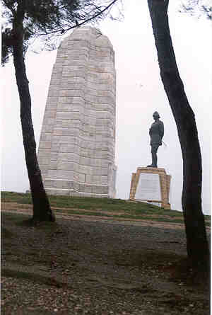 It was when Mustafa Kemal Ataturk saw this view on the morning of 25 April 1915 that he realised the whole campaign lay in protecting Chunuk Bair and the surrounding hill tops. Other Turkish commanders had not noticed this. Had Ataturk not seen it, then perhaps everything might have turned out very different. The Turkish Memorial to Mustafa Kemal Ataturk, right on the summit of Chunuk Bair. The New Zealand Memorial is right beside the statue of Mustafa Kemal Ataturk. The statue looks directly down across Rhododendron Ridge to Ari Burnu Point at the northern end of Anzac Cove. |
