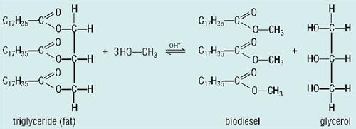 We can’t run our trucks on bucket-loads of meat fat: even runny cooking oil is far too thick to use directly in a diesel engine. The fat molecules will need to be broken up first. However, the saponification process used to make soap does not produce a usable fuel because the glycerol makes the mixture sticky. If the glycerol formed is simply removed, the result is a solid fatty acid. Fatty acids make great candles, but you can’t run a truck engine on candles. Carboxylic acids like stearic acid are solid at room temperature because the –OH group of one molecule hydrogen bonds with the lone pairs on the C=O of another molecule. If only we could stop them from forming hydrogen bonds.... Easy! Change the –OH into an –OCH3 . In biodiesel plants all over the world, chemists are taking fats or oils and reacting them with methanol (or ethanol) in a process called transesterification. The methanol breaks the COO groups in the oils in the same way that water does. The result is a mixture of esters such as methyl stearate, plus glycerol. Because the esters don’t form hydrogen bonds, they have lower melting points than their parent acids, so they are liquid at room temperature and they do not mix with the glycerol, so it is a simple matter to drain off the glycerol (which is more dense), leaving the esters behind.