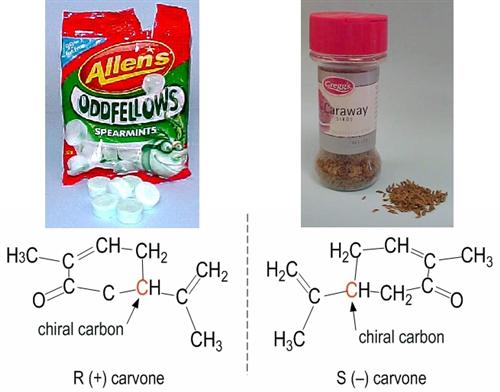 (+) carvone, while caraway oil contains S (–) carvone. They smell differently,