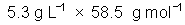 Convert 5.3 g L-1 NaCl into mol L-1. M(NaCl) = 58.5 g mol-1.